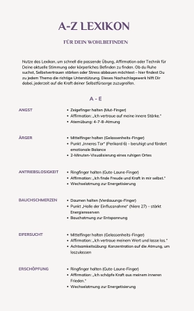 • ✨ A-Z Lexikon für Wohlbefinden: Finde auf einen Blick die passende Übung für jedes Bedürfnis – ob Stress, Wut, Selbstzweifel oder Anspannung.